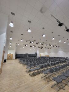 In the Drama Hall, three six-metre internally wired lighting bars are installed over the stage. To these are fitted a range of zoom spots, moving head gobo projectors, and parcans.